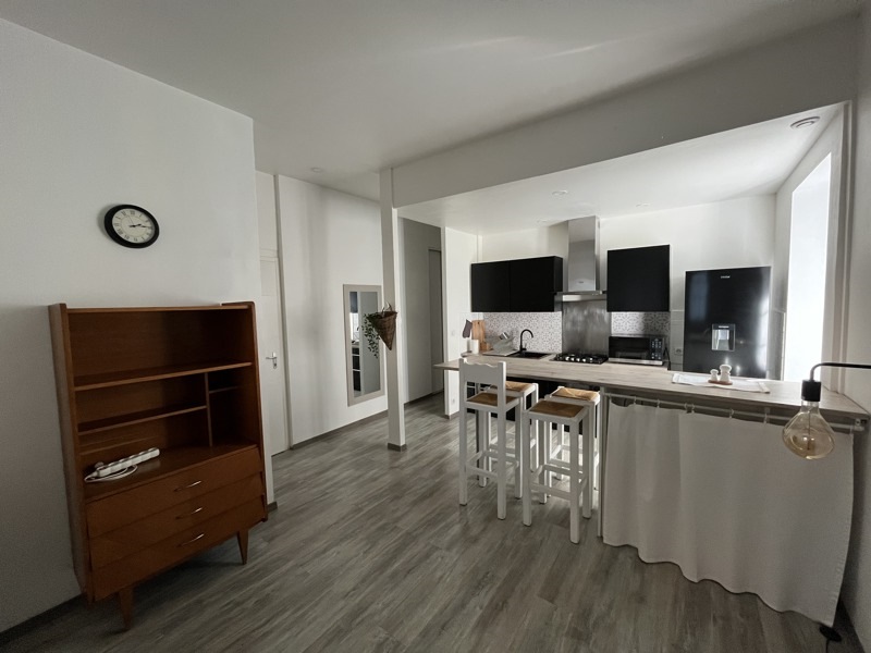 ANGOULEME – Coup de cœur au cœur de la rue piétonne ! Appartement meublé entièrement rénové : Entrée indépendante au RDC. Premier étage : belle pièce de vie lumineuse avec cuisine équipée ouverte sur véranda et accès à une terrasse avec vue sur les toits. 1 chambre, salle d’eau, WC. Garage privé. Proche bus et commodités. Libre