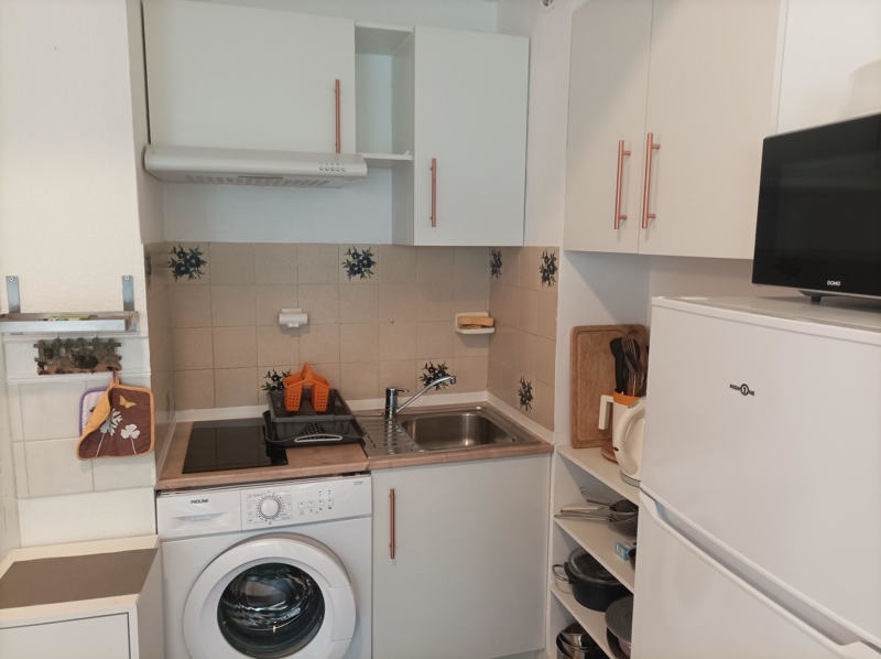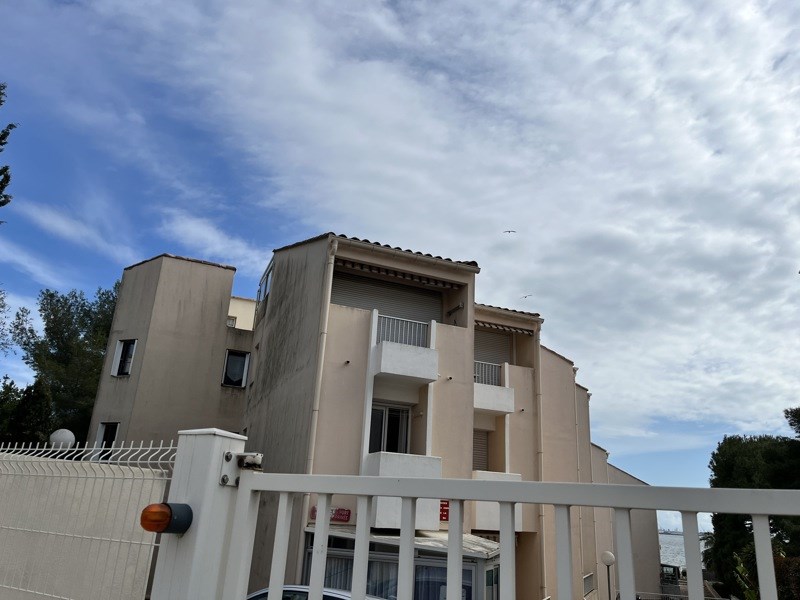 Balaruc-les-bains, entre le centre ville et l'étang de Thau, appartement 2 pièces : entrée, séjour donnant sur terrasse, cuisine ouverte, une chambre avec placard, salle d'eau avec wc. Parking libre dans la résidence.