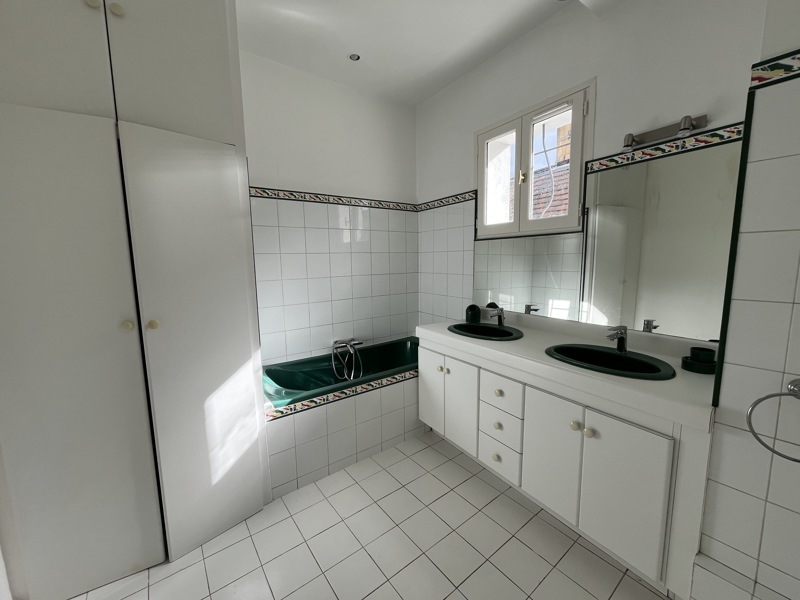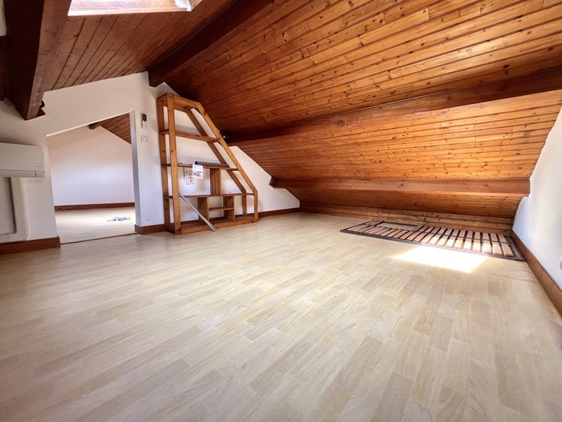 Maison offrant un séjour lumineux, une cuisine séparée et aménagée, deux chambres, deux salles de bain, un palier avec dressing, et deux pièces mansardées. Le bien comprend deux jardins, ainsi qu’une cave et un garage. Le chauffage est assuré par une chaudière fioul complétée par un système électrique.