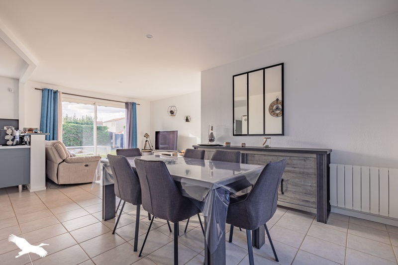 Maison de plain pied composée d'une entrée avec WC et placard, salon/salle à manger avec cuisine ouverte aménagée, un dégagement desservant 3 chambres et une salle d'eau. Un garage, un cabanon et un jardin clos complètent ce bien. Charges de copropriété et l'entretien de la haie inclus dans les charges.Disponible au 08 juin 2026.